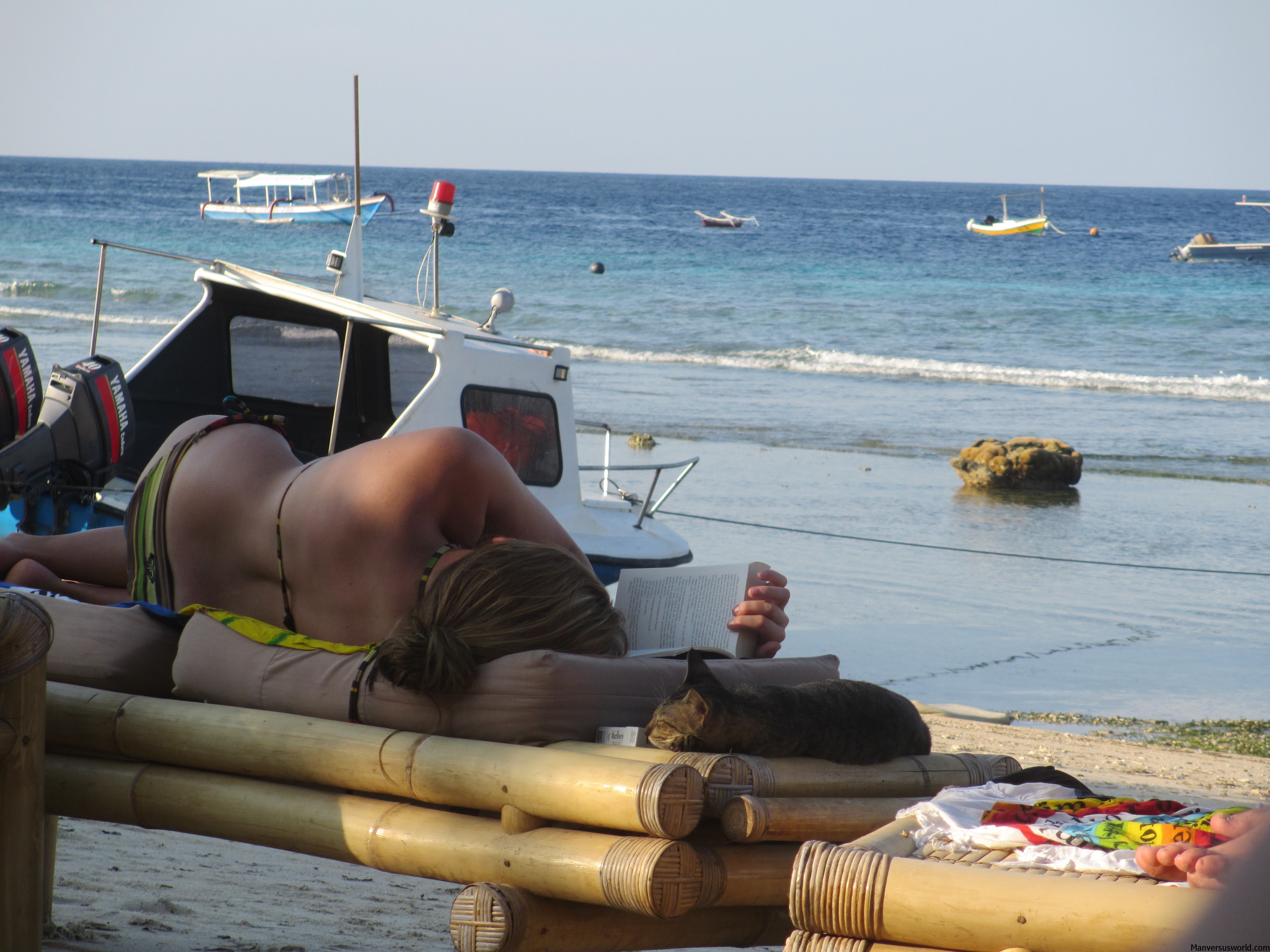 A cat lounges on the beach at Gili Trawangan, IndonesiaTwo things immediately struck me as I arrived on Gili Trawangan. First of all, there was no traffic to speak of, and, secondly, what’s with all the cats?