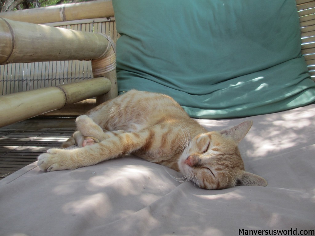 A cat sleeps on a beach chair in Gili TrawanganMost cats on the island are surprisingly affectionate, living something of a nomadic lifestyle as they roam around looking for food and affection. And most have either curled or stumpy tails, perhaps as a result of isolated breeding.