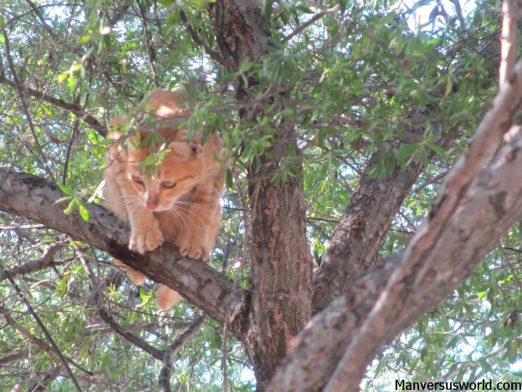A cat parades across the beach at Gili TrawanganA cat up a tree in Gili Trawangan, IndonesiaMan vs World will feature more about Gili Trawangan in the future; manly stuff, like the remarkable true story of my tussle with a sea snake and a turtle (not at the same time). Until then, happy travels!