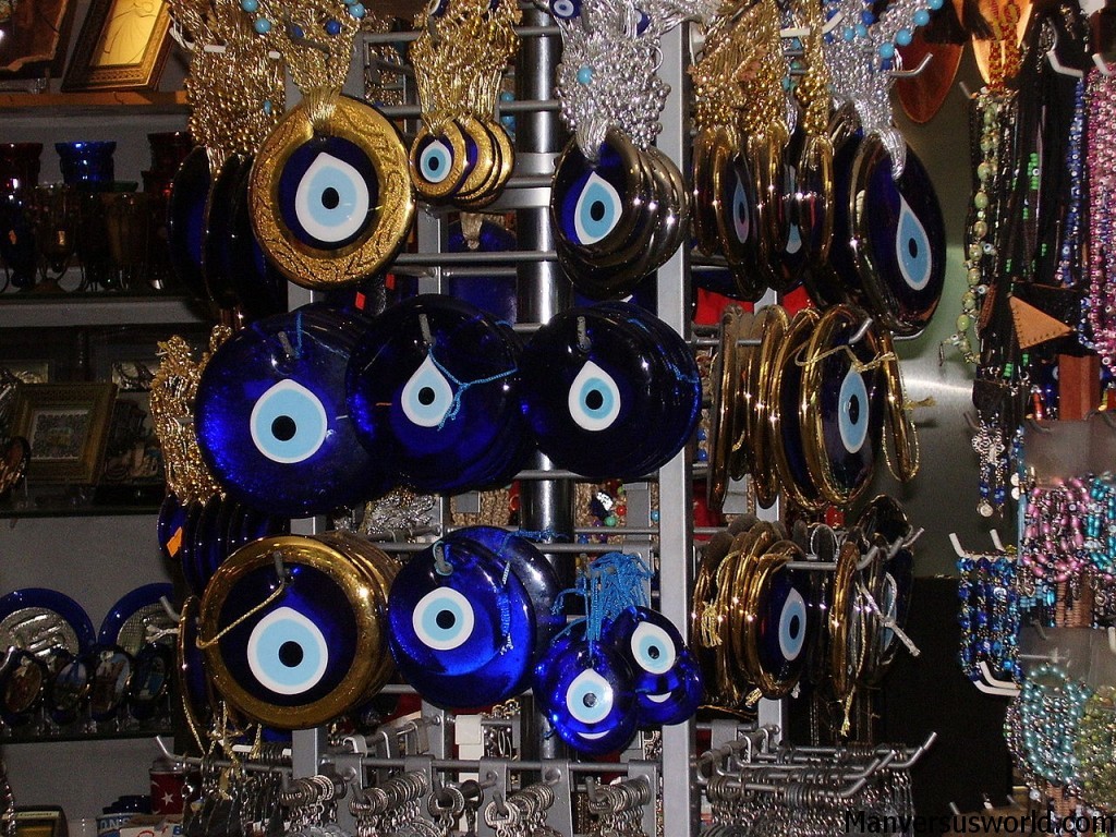 They’re all over Turkey – in shops and markets, hanging from doorways and in cars. Babies wear the blue evil eye knitted in to their clothing and people wear the protective trinkets around their neck or wrists as jewellery.